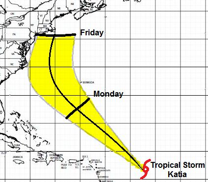 A quiet first half of the weekend lead to a downturn by Monday night. Heavy rain from the remnants of the tropical storm in the gulf will be amplified by the passage of a cold front on Tuesday. Looking ahead to the late week – that Pacific-Atlantic connection between ridges is starting to become more apparent. We are looking for a strengthening Bermuda high while a less than impressive trough becomes situated over the spine of the Appalachians. Not unlike Irene, this may give Tropical Storm Katia the opportunity to track closer to the coast, potentially as a hurricane.