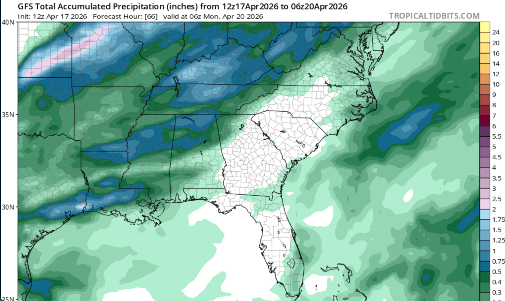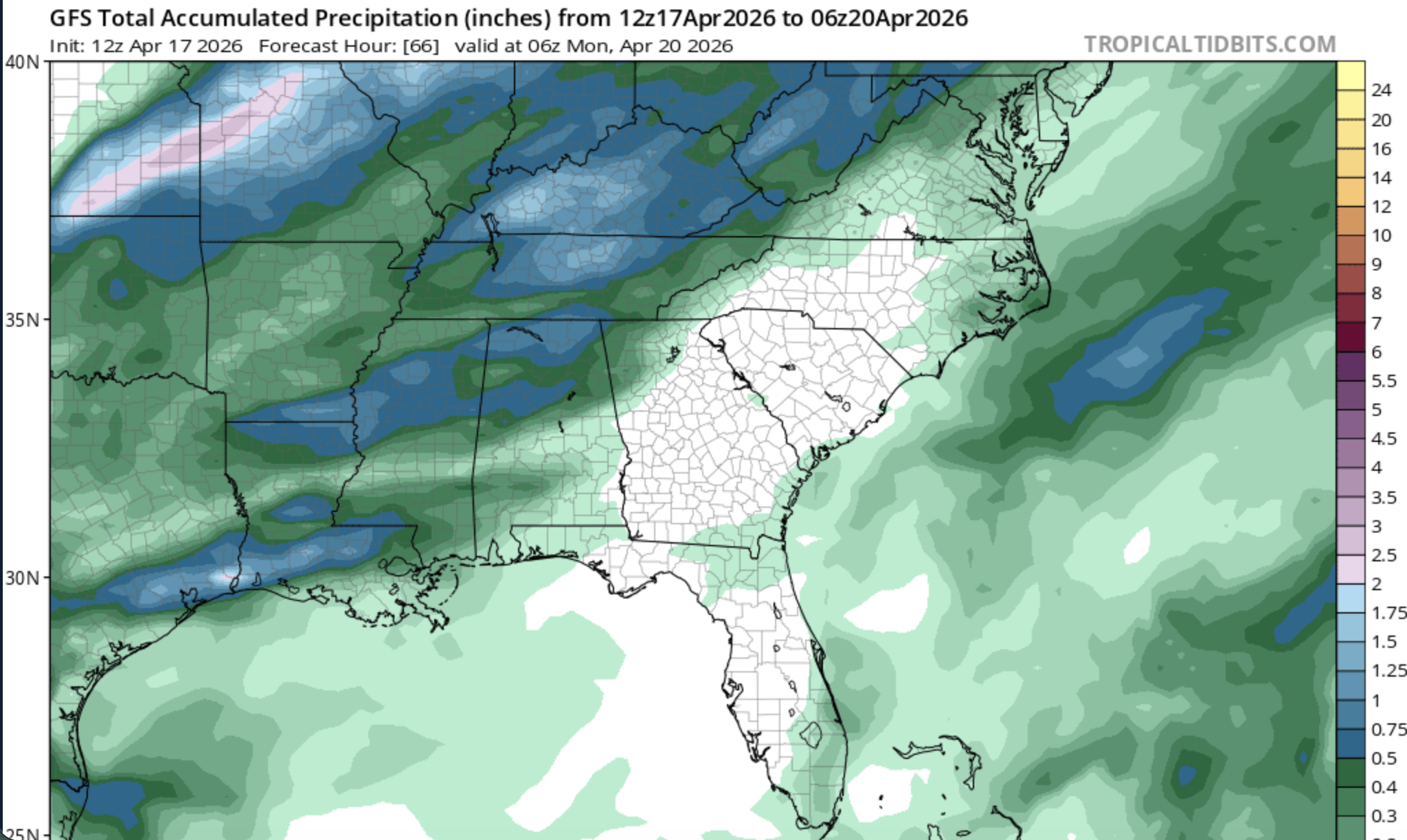 The prospects aren’t great in the near future. On Saturday, waie have an approaching cold front. This should help knock down are unseasonably warm temperatures for the second half of the weekend. Outside of far NW Georgia; however, the precipitation chances are paltry: