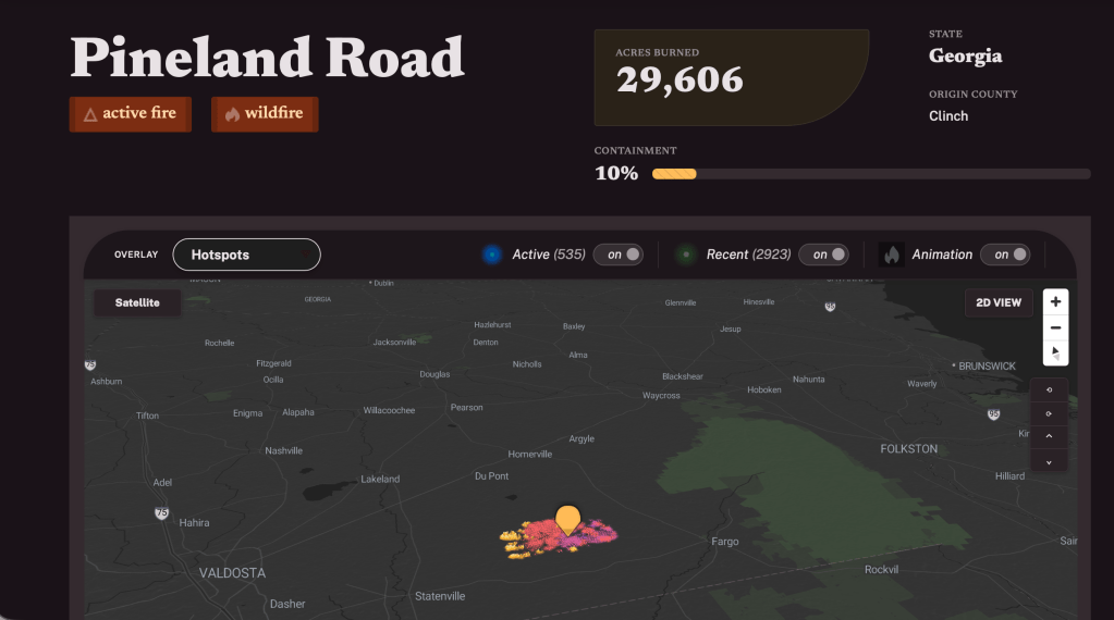 The first and by far the largest the Clinch/Echols County “Pineland Road fire” which is said to have burned nearly 30,000 acres as of 8 PM Wednesday! It is located in a large rural area between Valdosta and the Okefenokee Swamp.