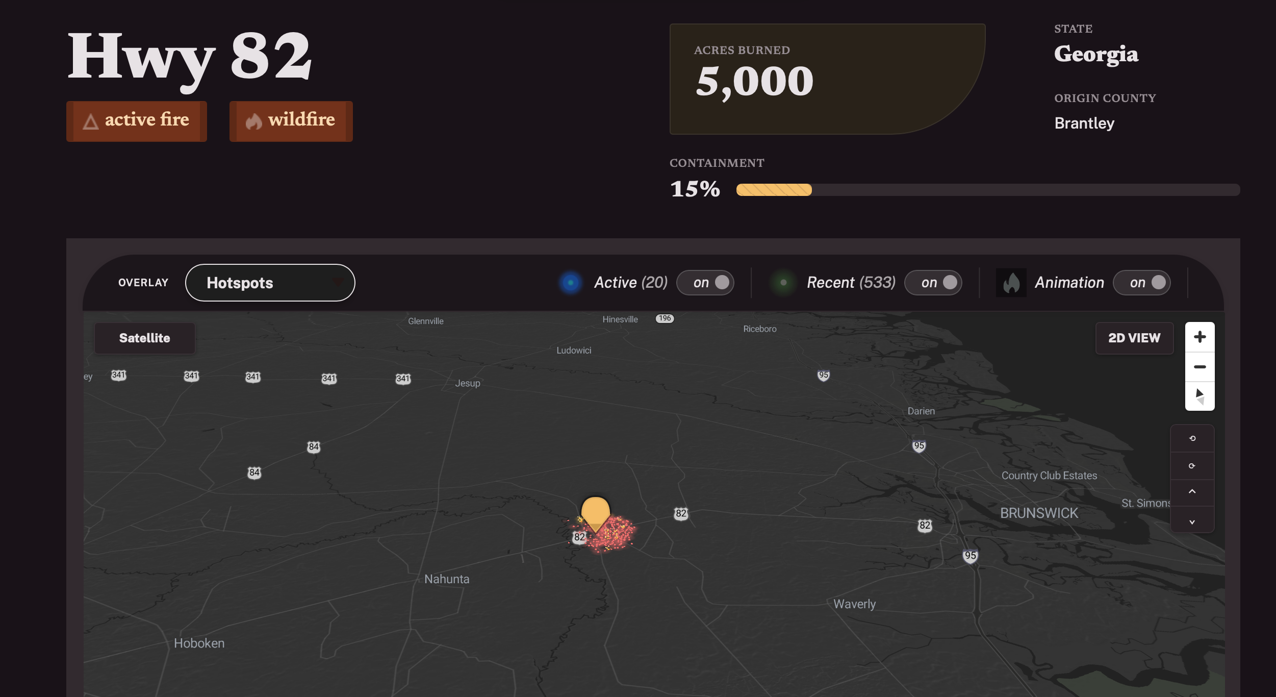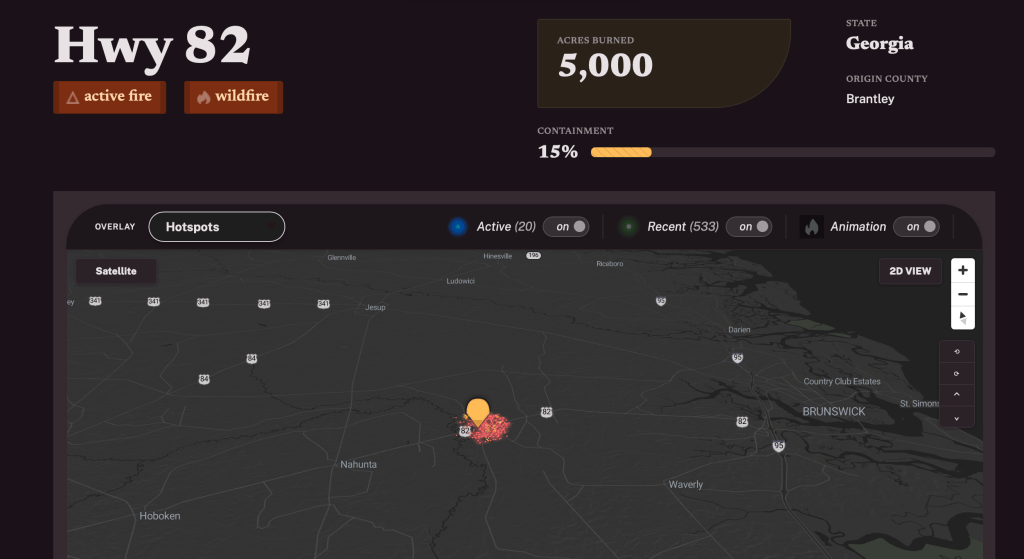 The second in Brantley County is just west of Brunswick along Highway 82 and has reached 5,000 acres. It’s fairing a little better with 15% containment as of the Wednesday evening report.
