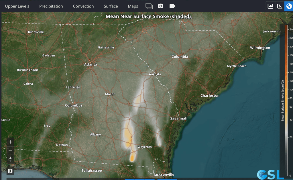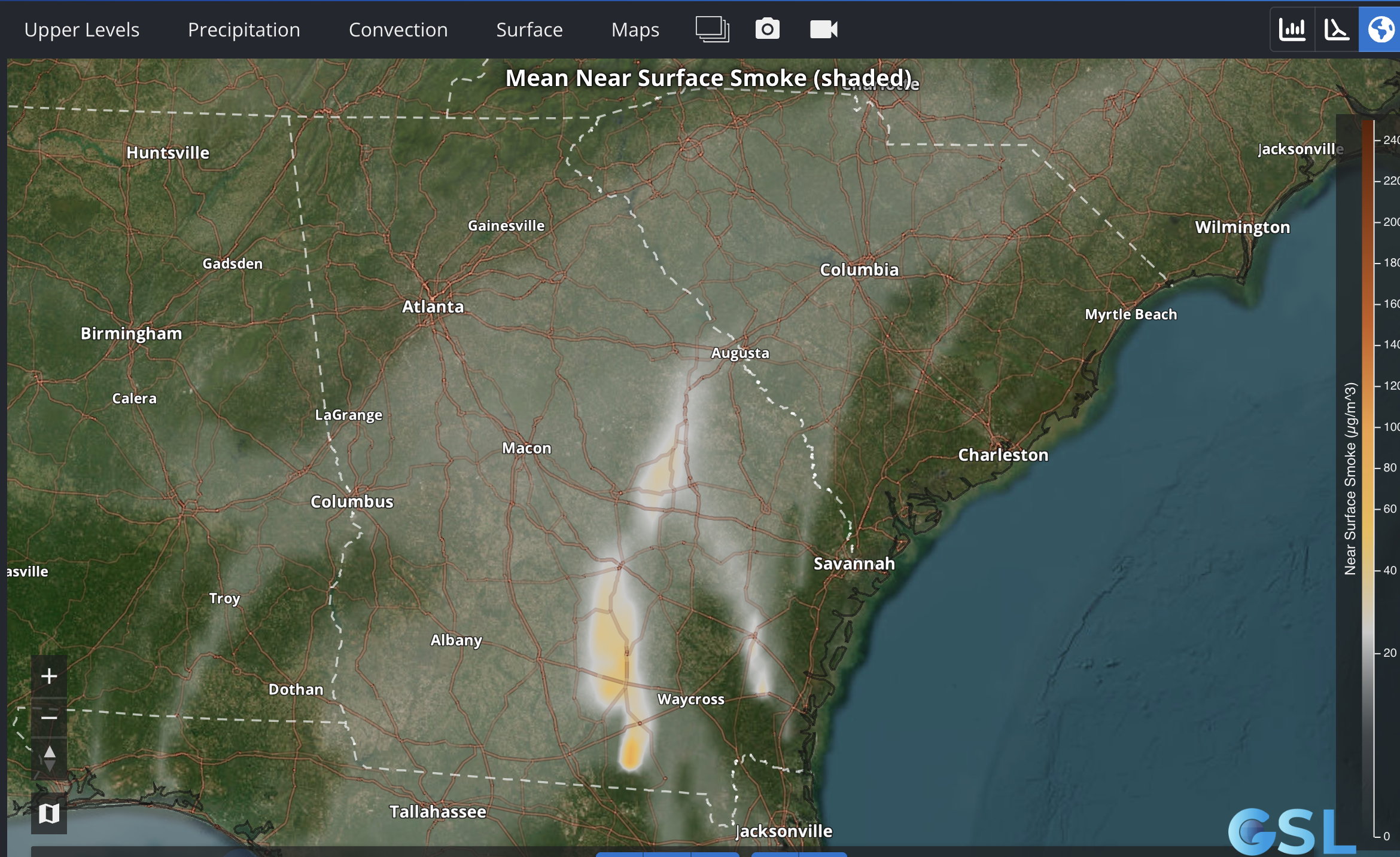 Smoke from these fires is impact a large area of the Peach State, into and including Metro Atlanta – but particularly for areas along and south of I-85. Air quality alerts have been hoisted for Metro Atlanta, Metro Augusta and much of central and western South Carolina.